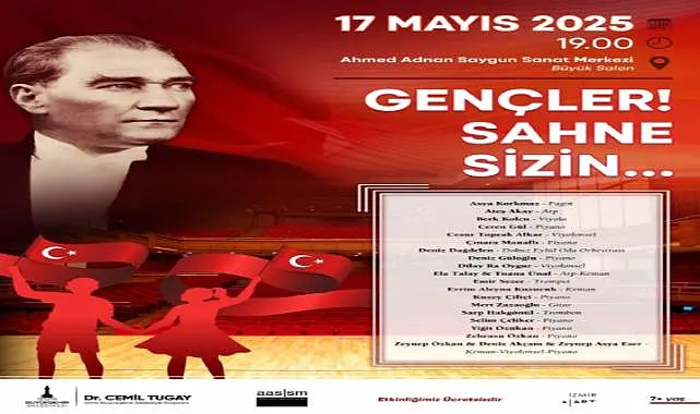 İzmir Büyükşehir Belediyesi Ahmed Adnan Saygun Sanat Merkezi (AASSM), 19 Mayıs Atatürk’ü Anma, Gençlik ve Spor Bayramı coşkusunu genç yeteneklerle birlikte kutlamaya hazırlanıyor. 14-20 yaş arası gençlerin başvuruları arasından seçilen 19 genç müzisyen, 17 Mayıs Cumartesi günü saat 19.00’da AASSM sahnesinde düzenlenecek akustik konserde müzikseverlerle buluşacak.
