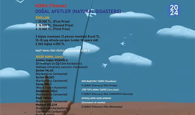 Muğla Büyükşehir Belediyesi tarafından uluslararası olarak düzenlenen bugüne kadar “Göç”, “Pandemi Covid 19”, “Yangın”, “Eğitim” temaları ile düzenlenen karikatür yarışmasının teması bu yıl “Doğal Afetler” oldu. Uluslararası Karikatür yarışmasına katılmak isteyenlerin 16 Şubat 2024 Cuma Günü mesai bitimine kadar “Muğla Büyükşehir Belediyesi 5. Uluslararası Karikatür Yarışması’’ başlığı ile sanatçının adı, soyadı, Şehir ve Ülkesi yazılarak [email protected] adresine göndermeleri yeterli olacak.