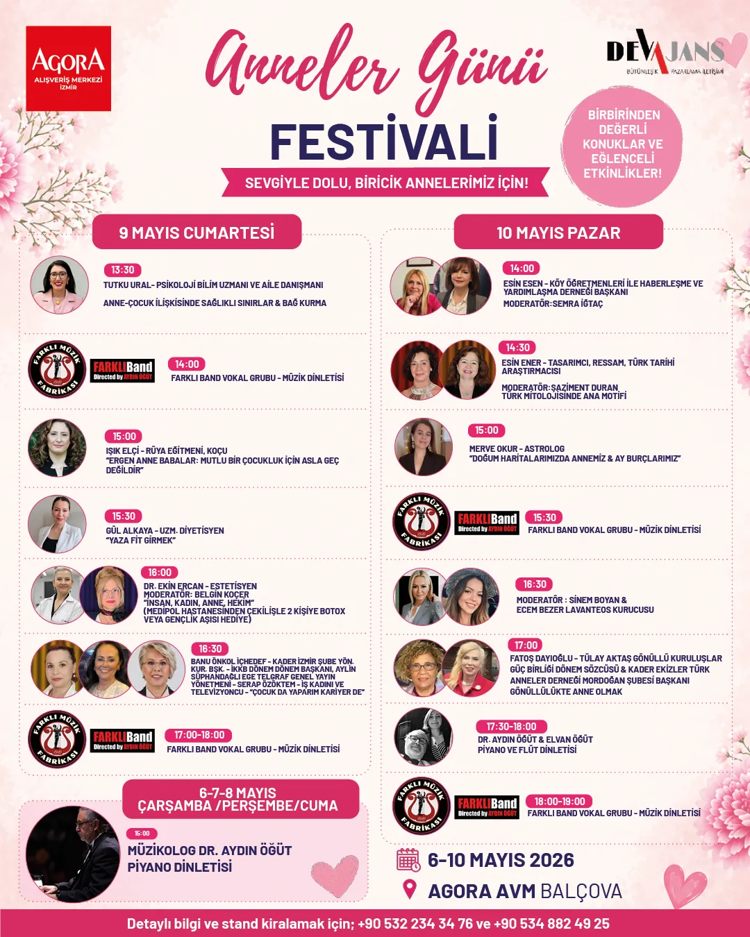 Agora AVM’de, Dev Ajans iş birliğiyle düzenlenecek Anneler Günü Festivali, 6-10 Mayıs 2026 tarihleri arasında ziyaretçilerini ağırlayacak. Beş gün sürecek etkinliklerde söyleşilerden müzik dinletilerine, kişisel gelişim oturumlarından sürpriz çekilişlere kadar geniş bir program yer alacak. Festival alanında ayrıca kurulacak satış stantlarıyla ziyaretçilere alışveriş imkânı da sunulacak.