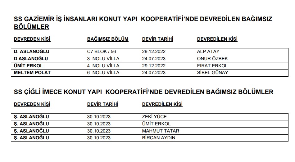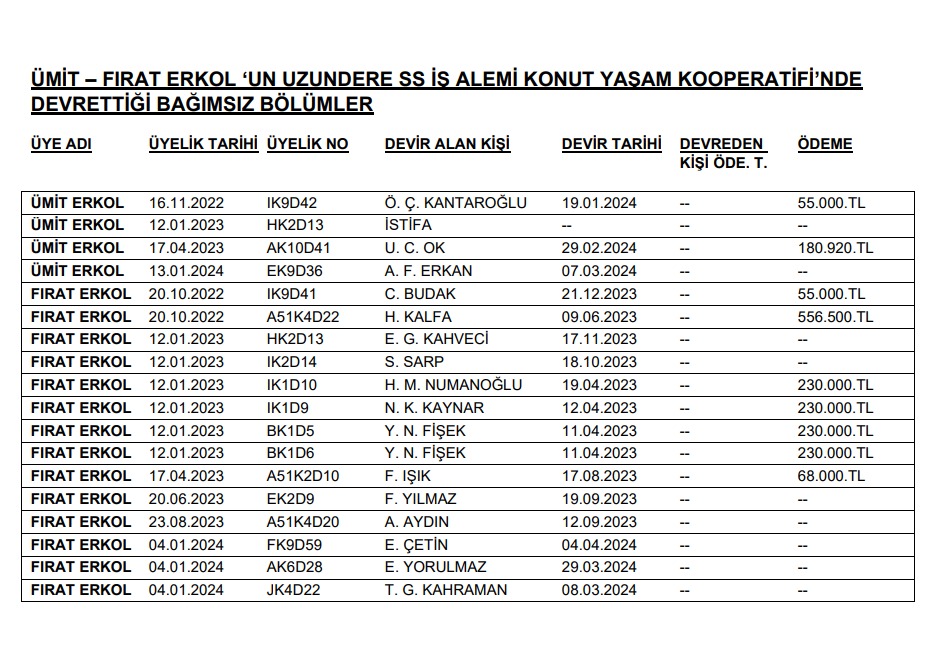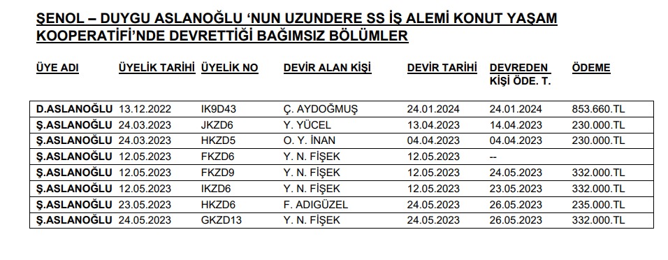 Atmaca, Şenol Aslanoğlu ve Duygu Aslanoğlu’nun Uzundere SS İş Alemi Konut Yaşam Kooperatifi’nde devrettiği bağımsız bölümlere ilişkin bir listeyi de paylaşarak, kamuoyunun bu devirler konusunda şeffaf bir açıklama beklediğini ifade etti.