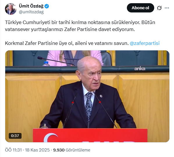 Açıklamaların ardından Zafer Partisi lideri Ümit Özdağ ise, "Türkiye Cumhuriyeti bir tarihi kırılma noktasına sürükleniyor" dedi. Özdağ ayrıca, "Bütün vatansever yurttaşlarımızı Zafer Partisine davet ediyorum. Korkma! Zafer Partisine üye ol, aileni ve vatanını savun” ifadelerini kullandı.