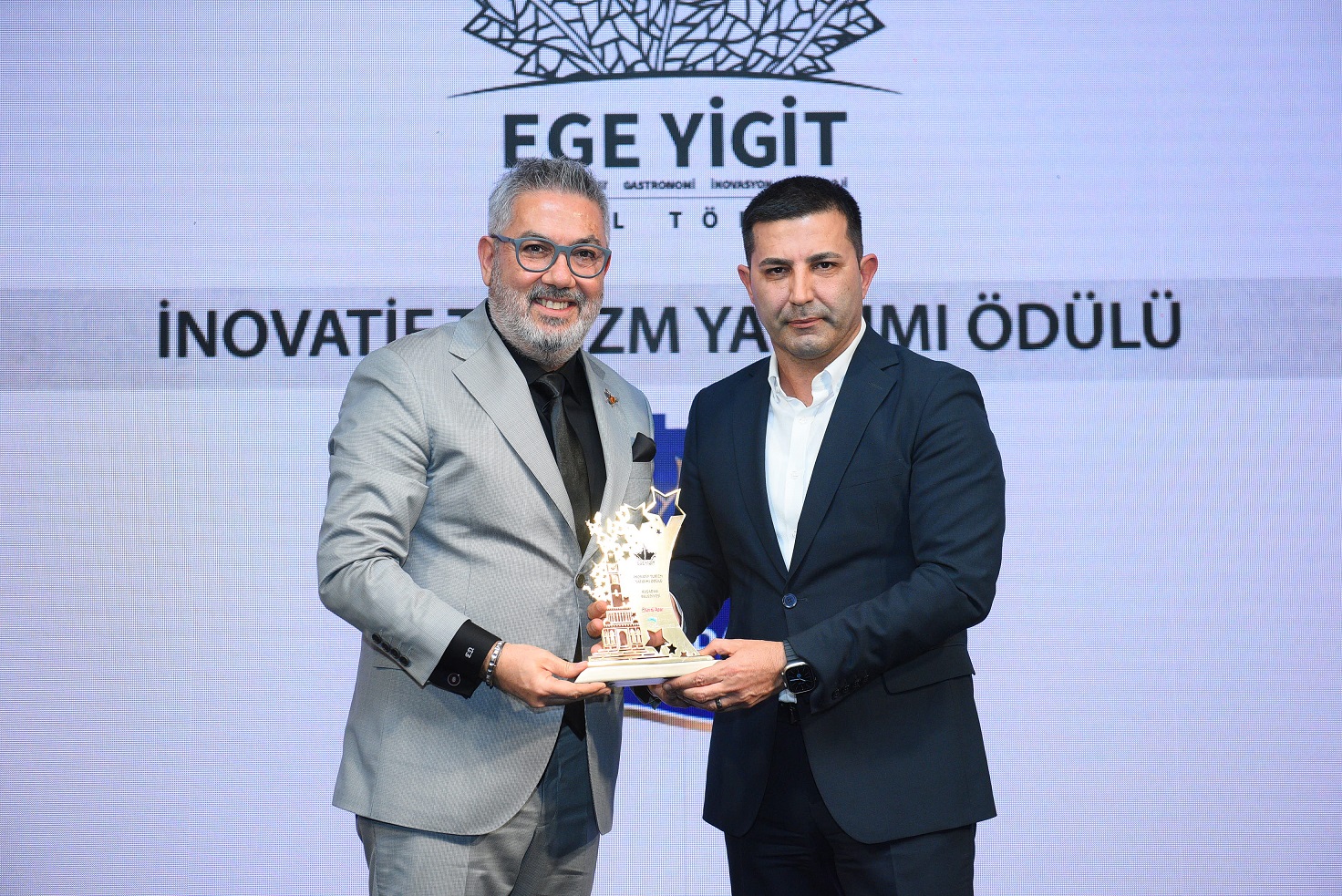 Başkan Ömer Günel’e Yeni Asır’ın geleneksel “Ege Yatırım İhracat Gastronomi İnovasyon Teknoloji (EGE YİGİT) Ödülleri kapsamında İnovatif Turizm Yatırımı Ödülü verildi. İzmir’de düzenlenen törende ödülünü Yeni Asır Genel Yayın Yönetmeni Ercan Demir’in elinden alan Başkan Ömer Günel, ikinci kez bu ödüle layık görülmenin mutluluk verici olduğunu belirtti.