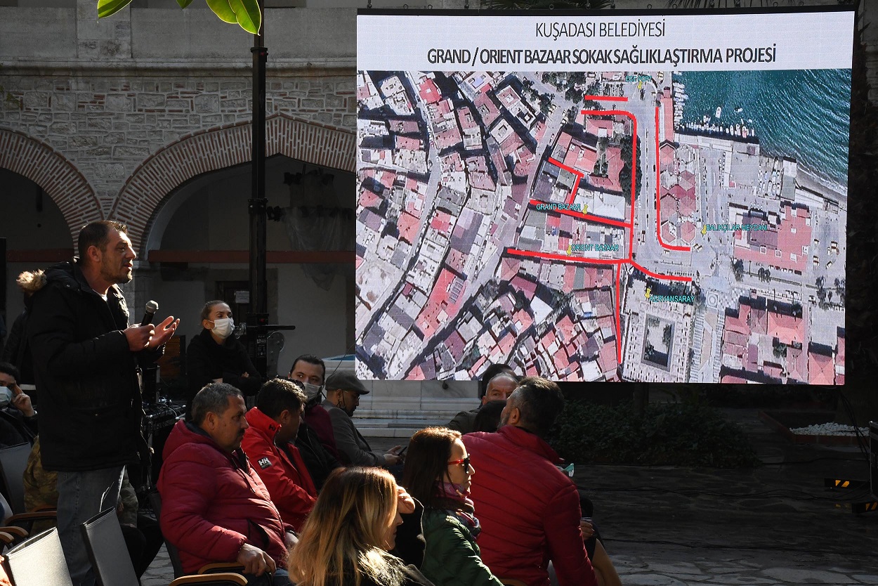 Toplantıda konuşan Başkan Ömer Günel, çalışmaların başlatılacağı bölgeye 53 yıldır yatırım yapılmadığını belirterek, “Geçtiğimiz yıl Aydın Büyükşehir Belediyesi ile iş birliğinde kentimizdeki turistik çarşıların büyük kısmını yenilemiştik. Grand ve Orient Bazaar’ın bulunduğu alanı da yenileyeceğimize dair esnafımıza söz vermiştik. Şimdi bu sözü tutacak olmanın mutluluğunu yaşıyoruz. Proje kapsamında ilk kazma perşembe günü vurulacak. Türkiye’nin içinden geçtiği tüm ekonomik olumsuzluklara rağmen Kuşadası Belediyesi olarak her zaman esnafımızın yanında olmak için elimizden geleni yapıyoruz. Çalışmalar bittiğinde Grand ve Orient Bazaar özellikle kruvaziyer gemilerinden inen turistler için bir cazibe merkezi olacak” dedi.