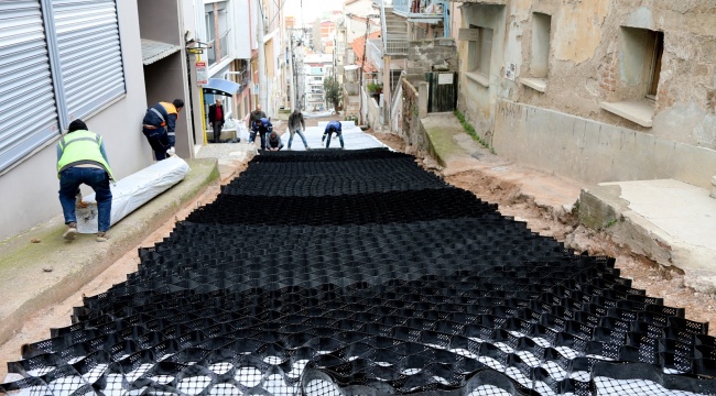 Fuat Edip Baksı Mahallesi’ndeki eğimli 1618 sokakta, otoyollarda kullanılan geogrid, geocell