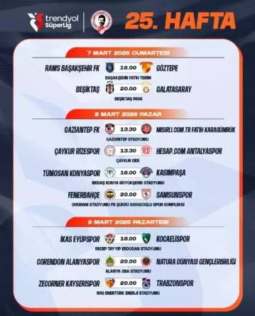 Trendyol Süper Lig'de 24-25. hafta programları açıklandı. Beşiktaş- Galatasaray derbisinin tarihi belli oldu. 25. haftadaki Beşiktaş-Galatasaray derbisi 7 Mart tarihinde saat 20:00'de oynanacak.