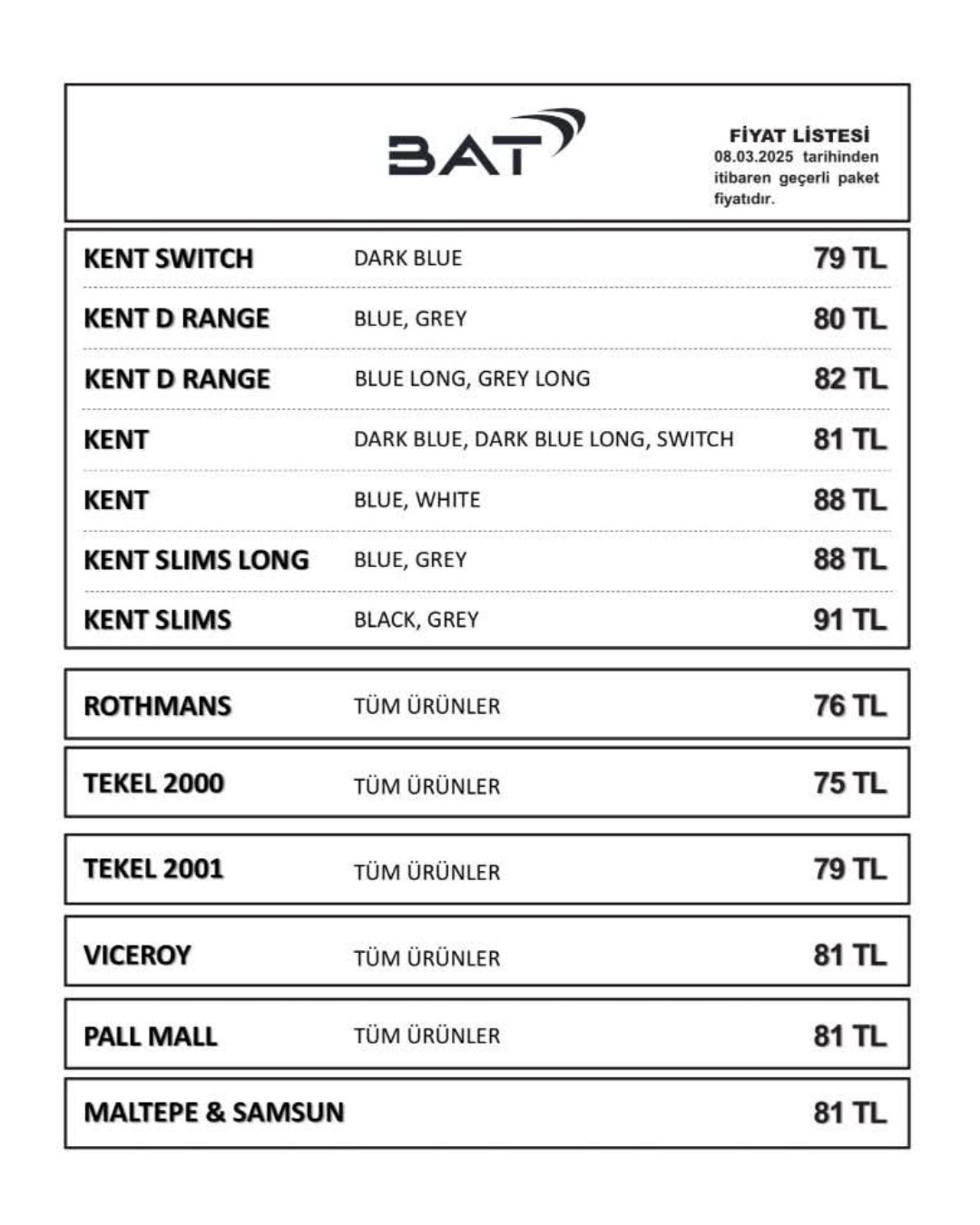 Sigaraya gelen zamların ardı arkası kesilmiyor. Neredeyse her gün bir sigara grubuna daha zam geliyor. Bu kez zamlardan nasibini alan sigara grubu ise BAT oldu. Zam haberini Tekel Bayileri Yardımlaşma Derneği Başkanı Erol Dündar sosyal medya hesabı üzerinden duyurdu. BAT grubuna gelen zamla birlikte en ucuz sigara fiyatı 75 TL olurken en pahalısı ise 91 TL oldu.