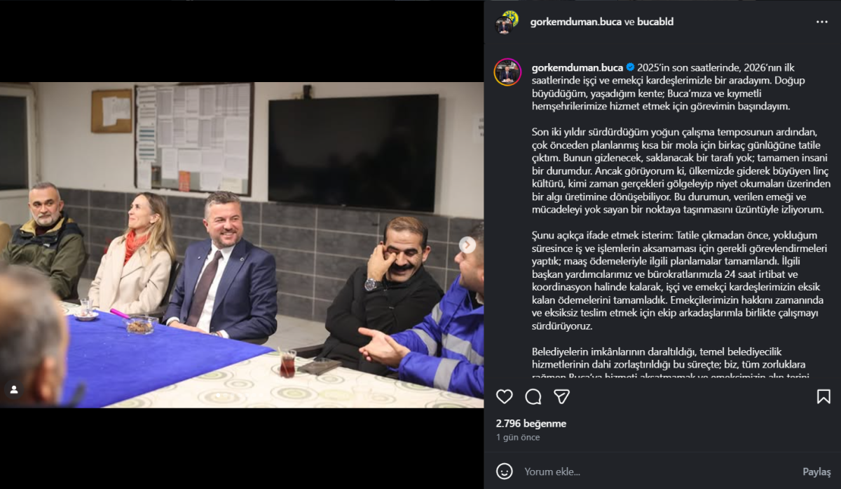 Görkem Duman’ın sosyal medya hesabından yaptığı ilk açıklamanın tamamı şu şekilde: “2025’in son saatlerinde, 2026’nın ilk saatlerinde işçi ve emekçi kardeşlerimizle, Bucalı esnafımızla bir aradayım. Doğup büyüdüğüm, yaşadığım kente; Buca’mıza ve kıymetli hemşehrilerimize hizmet etmek için görevimin başındayım.