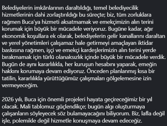 Belediyelerin imkânlarının daraltıldığı, temel belediyecilik hizmetlerinin dahi zorlaştırıldığı bu süreçte; biz, tüm zorluklara rağmen Buca’ya hizmeti aksatmamak ve emekçimizin alın terini korumak için büyük bir mücadele veriyoruz. Bugüne kadar, ağır ekonomik koşullara ek olarak, belediyelerin gelir kanallarını daraltan ve yerel yönetimleri çalışamaz hale getirmeyi amaçlayan iktidar baskısına rağmen, işçi ve emekçi kardeşlerimizin alın terini yerde bırakmamak için türlü olanaksızlık içinde büyük bir mücadele verdik. Bugün de aynı kararlılıkla, her kuruşun hesabını yaparak, emeğin hakkını korumaya devam ediyoruz. Önceden planlanmış kısa bir tatilin, kararlılıkla yürüttüğümüz çalışmaları gölgelemesine izin vermeyeceğim.