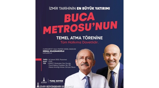 İzmir tarihinin en büyük yatırımı Buca Metrosu’nun temeli yarın atılıyor. İzmir Büyükşehir Belediye Başkanı Tunç Soyer, CHP Genel Başkanı Kemal Kılıçdaroğlu’nun da katılacağı törene tüm İzmirlileri davet etti. Tarihi buluşmayı izlemek isteyenler için Karşıyaka, Bostanlı, Bayraklı, Konak, Gaziemir, Balçova, Narlıdere ve Güzelbahçe’den Buca’ya saat 15.00’de hareket edecek ekspres hatlar oluşturuldu.