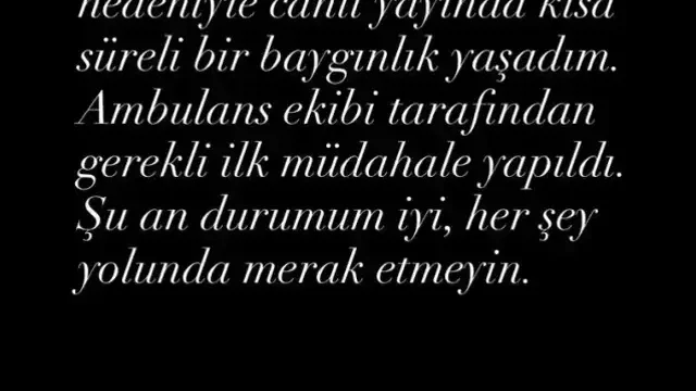 “Herkese merhaba, doğuştan gelen kalp ritim bozukluğum nedeniyle canlı yayında kısa süreli bir baygınlık yaşadım. Ambulans ekibi tarafından gerekli ilk müdahale yapıldı. Şu an durumum iyi, her şey yolunda merak etmeyin.”