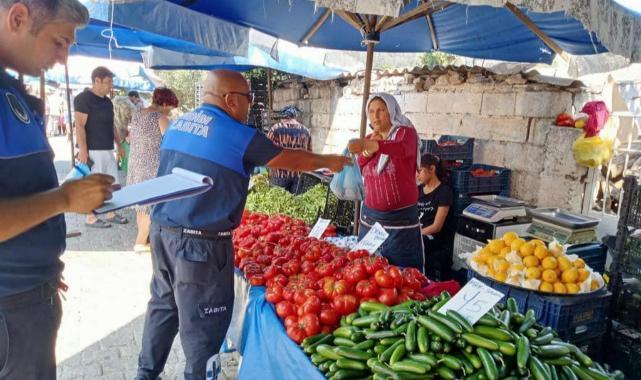 kurulan halk pazarında denetimler gerçekleştirdi. Pazaryeri denetimi kapsamında tezgâhları gezen