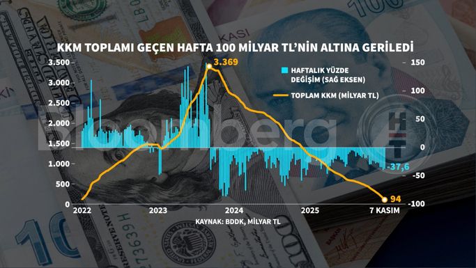 Bankacılık Düzenleme ve Denetleme Kurumu verilerine göre, Kur Korumalı Türk Lirası Mevduat ve Katılma Hesapları (KKM) 7 Kasım haftasında 37 milyar 629 milyon TL azalarak, 93 milyar 825 milyon TL’ye geriledi.