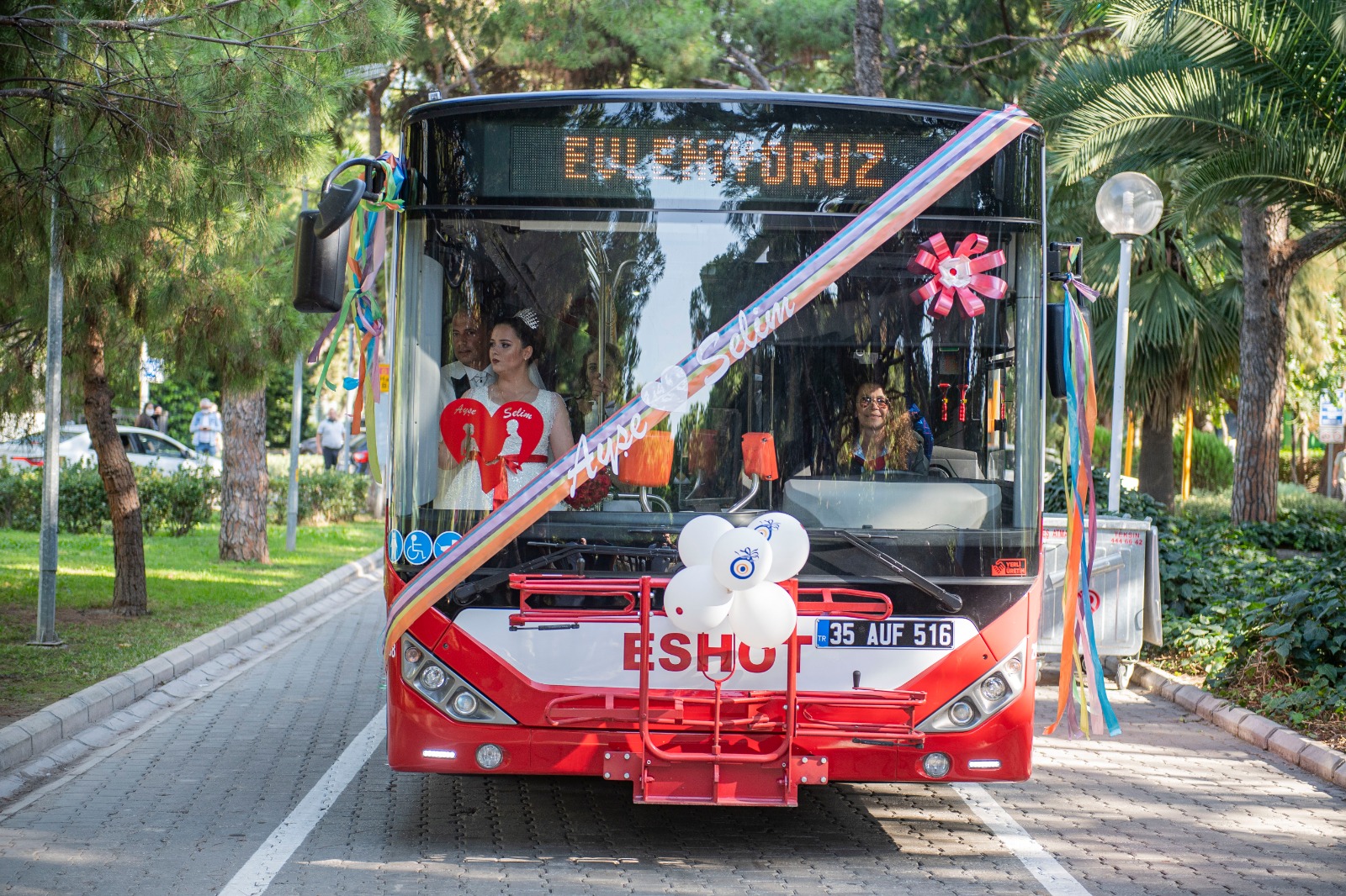 Meslektaşlarının, ESHOT Gediz Atölyesi’nde süslediği “gelin otobüsü”, gelin Ayşe Akyol’u evinden aldı. Kısa bir şehir turunun ardından çiftin nikahı Kültürpark Evlendirme Dairesi’nde kıyıldı.