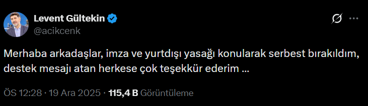 Serbest bırakılmasının ardından X hesabından bir açıklama yapan Levent Gültekin, “Merhaba arkadaşlar, imza ve yurt dışı yasağı konularak serbest bırakıldım. Destek mesajı atan herkese çok teşekkür ederim” ifadelerini kullandı.