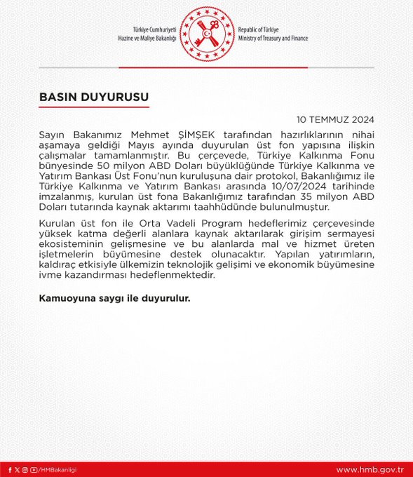 "Sayın Bakanımız Mehmet Şimşek tarafından hazırlıkların nihai aşamaya geldiği Mayıs ayında duyurulan üst fon yapısına ilişkin çalışmalar tamamlanmıştır. Bu çerçevede, Türkiye Kalkınma Fonu bünyesinde 50 milyon ABD doları büyüklüğünde Türkiye Kalkınma ve Yatırım Bankası Üst Fonu'nun kuruluşuna dair protokol, Bakanlığımız ile Türkiye Kalkınma ve Yatırım Bankası arasında 10.07.2024 tarihinde imzalanmış, kurulan üst fona Bakanlığımız tarafından 35 milyon ABD doları tutarında kaynak aktarımı taahhüdünde bulunulmuştur.