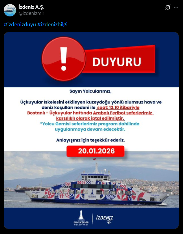 İZDENİZ tarafından yapılan açıklamada, saat 13.10 itibarıyla Bostanlı–Üçkuyular hattında hizmet veren arabalı feribot seferlerinin karşılıklı olarak iptal edildiği belirtildi. Güvenli ulaşımın sağlanması amacıyla alınan kararın, hava ve deniz koşullarının normale dönmesine kadar geçerli olacağı ifade edildi.