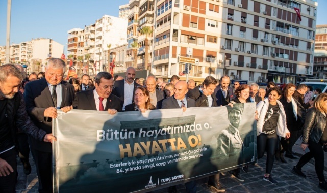 İzmir Büyükşehir Belediyesi’nin ulu önder Mustafa Kemal Atatürk’ün aramızdan ayrılışının 84. yıl dönümünde binlerce yurttaşı “Bütün hayatımızda o. Hayatta o!” yazılı pankartın arkasında bir araya getirdi. Ata’ya Saygı yürüyüşü Alsancak Limanı’ndan Cumhuriyet Meydanı’na kadar sürdü. Yürüyüşe İzmir Büyükşehir Belediye Başkanı Tunç Soyer, İzmir Büyükşehir Belediyesi Başkan Vekili Mustafa Özuslu, CHP İzmir İl Başkanı Deniz Yücel, Konak Belediye Başkanı Abdül Batur, sivil toplum örgütleri ve sendikalarla yurttaşlar katıldı.