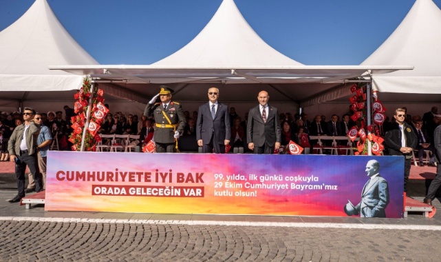 İzmir Valisi Yavuz Selim Köşger, “Cumhuriyet nasıl küllerinden doğmuşsa, tüm dünyanın sesini kısmaya çalıştığı dönemde nasıl ‘Ya istiklal ya ölüm’ dediyse yine küllerinden doğmayı başaracak bir milletiz. Mustafa Kemal Atatürk’ü ve aziz şehitlerimizi, kahraman gazilerimizi sonsuz şükran ve rahmetle anıyorum. 100’üncü yılına emin adımlarla ilerleyen Cumhuriyetimiz nice yüzyıllara ulaşacak” dedi. Cumhuriyet Meydanı'ndaki kutlamalar resmigeçit töreniyle son buldu.