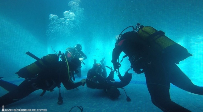 Sualtı arama kurtarma dalgıç ekipleri Büyükşehir’in Buca Sosyal Yaşam Kampüsü içerisinde yer alan havuzda haftanın üç günü sabahın erken saatlerinde eğitime başlıyor. Yürüme parkuru, şınav, mekik, barfiks ve yüzme becerilerinin ardından farklı felaket senaryolarına göre sualtındaki olaylara müdahale çalışması yapıyor.