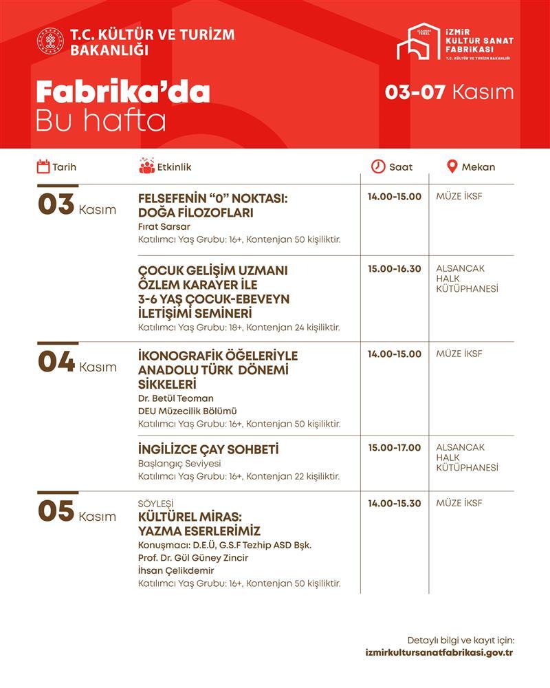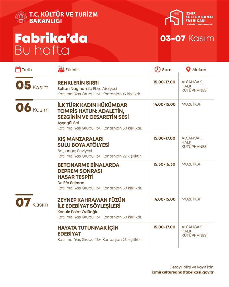 Yaş ve kontenjan sınırı bulunan etkinlikler için kayıt yaptırmak isteyenlerin İzmir Kültür Sanat Fabrikası’nın web sitesini ziyaret etmesi gerekiyor.