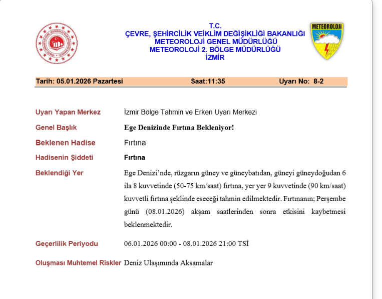 Fırtınanın 6 Ocak 2026 saat 00.00 ile 8 Ocak 2026 saat 21.00 arasında etkili olmasının beklendiği belirtilirken, bu süreçte deniz ulaşımında aksamalar yaşanabileceği kaydedildi. Yetkililer, denizciler ve vatandaşların yapılan uyarıları dikkate almaları çağrısında bulundu.