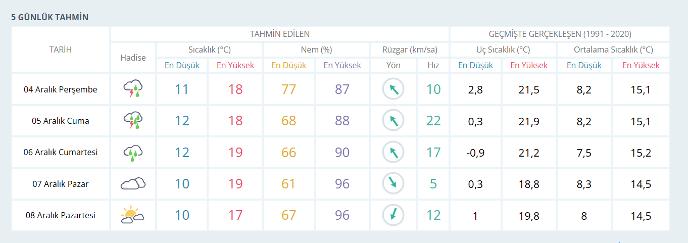 Meteoroloji Genel Müdürlüğü’nün değerlendirmelerine göre 4 Aralık Perşembe günü İzmir’de gök gürültülü sağanak yağış etkili olacak ve sıcaklık 18 derece ölçülecek. 5 Aralık Cuma günü de yağışlı hava sürerken sıcaklık yine 18 derece olacak. Hafta sonu için verilen tahminlerde ise 6 ve 7 Aralık tarihlerinde sıcaklıkların 19 dereceye yükseleceği yer yer yağışların devam edebileceği belirtiliyor.
