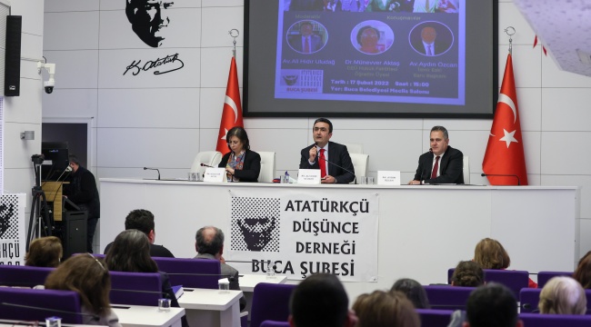 Atatürkçü Düşünce Derneği Buca Şubesi’nin Buca Belediyesi ev sahipliğinde gerçekleştirdiği Türk Medeni Kanunu konulu panelin moderatörlüğünü Av. Ali Hıdır Uludağ’ın yaparken, konuşmacıları ise İzmir Eski Baro Başkanı Av. Aydın Özcan ve Dokuz Eylül Üniversitesi (DEÜ) Hukuk Fakültesi Öğretim Üyesi Dr. Münevver Aktaş oldu. Panel öncesi bir açılış konuşması yapan Buca Belediye Başkanı Erhan Kılıç, Türk Medeni Kanunu’nun beşiktan mezara kadar hukuki tüm hakları sağlayan yegane yasa