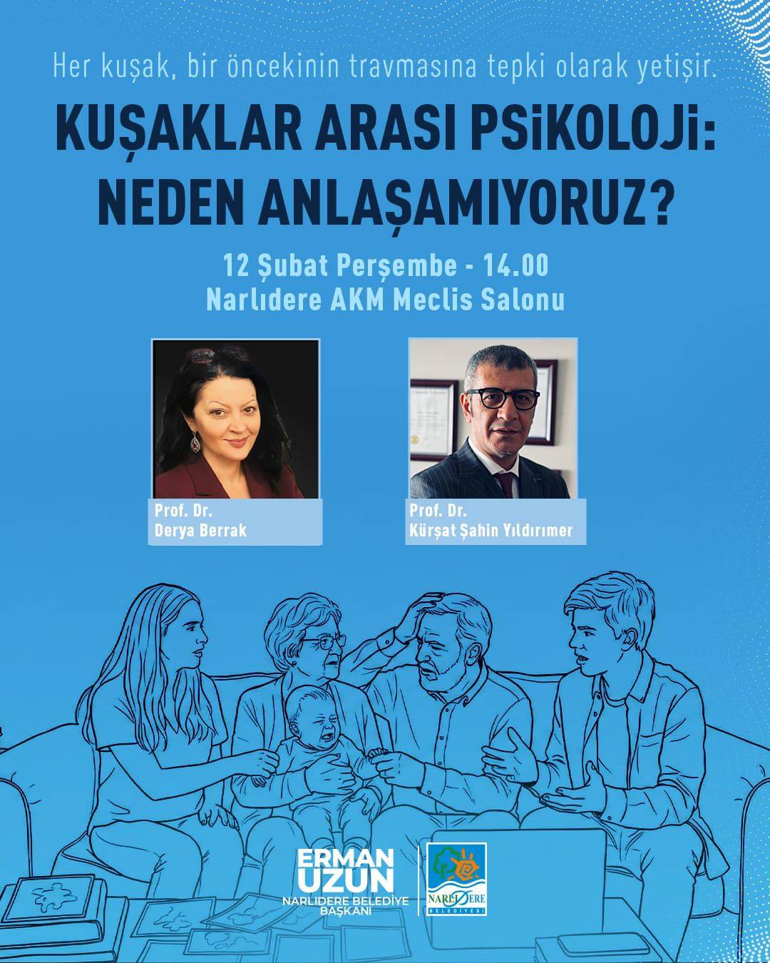 Narlıdere Belediyesi’nin katkıları ve Narlıdere Belediye Başkanı Erman Uzun’un destekleriyle gerçekleştirilecek “Kuşaklar, Psikolojik Kırılganlıklar ve Ebeveynlik Yaklaşımları” başlıklı seminerde, değişen toplumsal dinamiklerin aile yapısına etkileri kapsamlı biçimde ele alınacak.