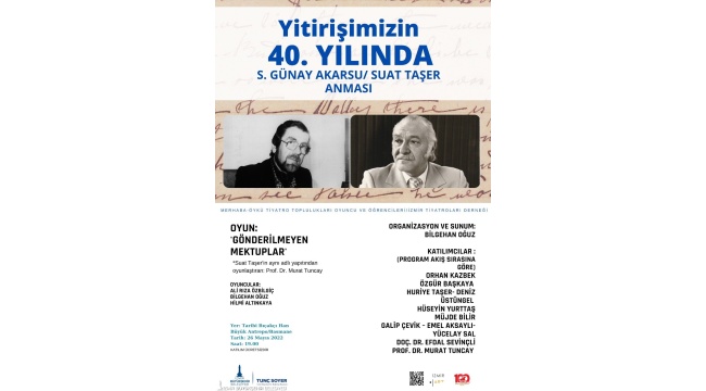Tiyatroyu halkla buluşturmak için önemli çalışmalar yürüten her iki sanatçının hayat hikayelerinin sunumlarla anlatılacağı gecede Prof. Dr. Murat Tuncay tarafından Suat Taşer’in “Gönderilemeyen Mektuplar” adlı yapıtından oyunlaştırılan tiyatro eseri, oyuncular Bilgehan Oğuz, Ali Rıza Özbilgiç, Hilmi Altınkaya tarafından sahnelenecek.