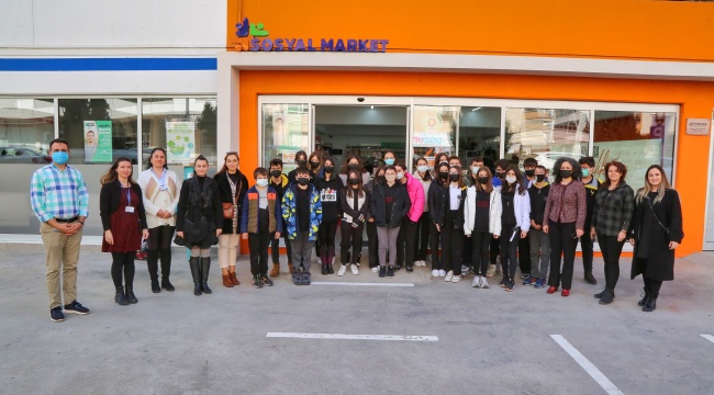 Gaziemir Belediyesi’nin mart ayında 547 aileye destek verdiği Sosyal Marketi’ni ziyaret eden Dokuz Eylül Koleji öğrencileri, iyilik merkezine bağışta bulundu.