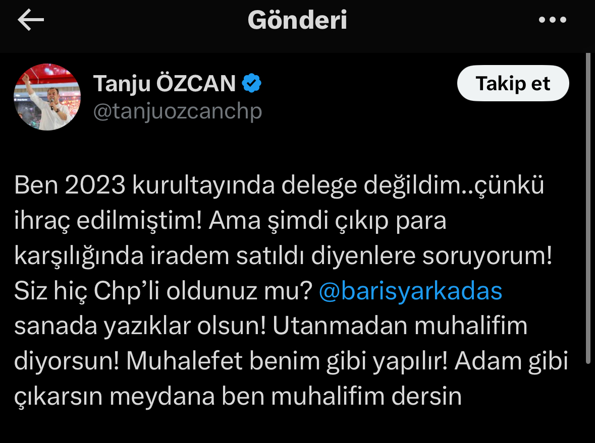''Ben 2023 kurultayında delege değildim..çünkü ihraç edilmiştim! Ama şimdi çıkıp para karşılığında iradem satıldı diyenlere soruyorum! Siz hiç Chp’li oldunuz mu? Barış Yarkadaş sanada yazıklar olsun! Utanmadan muhalifim diyorsun! Muhalefet benim gibi yapılır! Adam gibi çıkarsın meydana ben muhalifim dersin.''