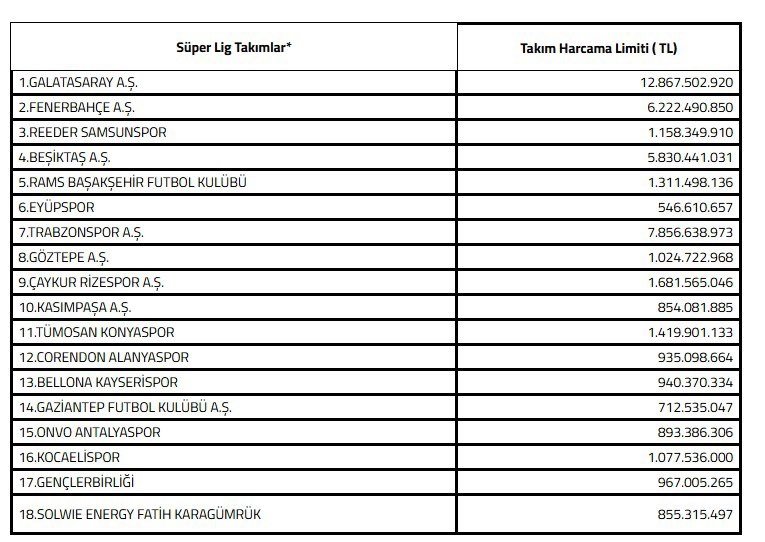 TÜM SÜPER LİG TAKIMLARININ HARCAMA LİMİTLERİ