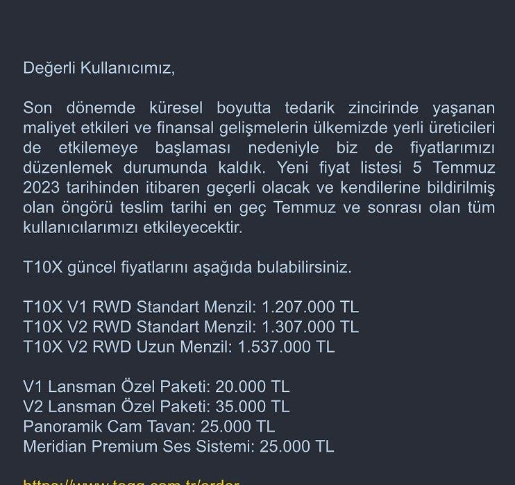TOGG tarafından gönderilen mailde, değerli kullanıcılara hitap edilerek, küresel ölçekte yaşanan tedarik zinciri maliyet etkileri ve finansal gelişmelerin Türkiye'deki yerli üreticileri de etkilemeye başladığı belirtildi. Bu sebeple, fiyat düzenlemelerine gitmek zorunda kaldıkları ifade edildi. Yeni fiyat listesinin 5 Temmuz 2023 tarihinden itibaren geçerli olacağı ve Temmuz ve sonrası teslim tarihine sahip olan tüm kullanıcıları etkileyeceği bildirildi.