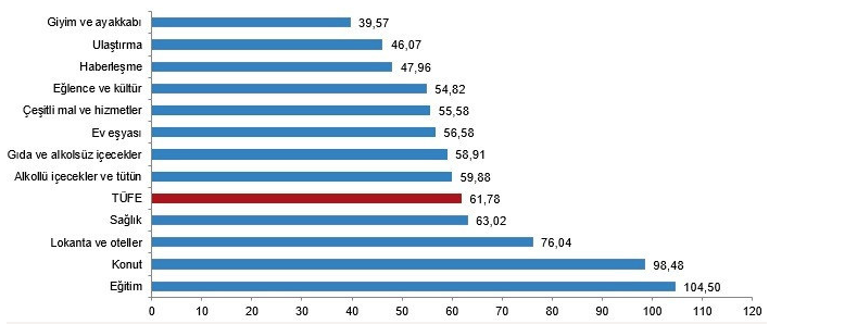 Bir önceki yılın aynı ayına göre en az artış gösteren ana grup yüzde 39,57 ile giyim ve ayakkabı oldu. Buna karşılık, bir önceki yılın aynı ayına göre artışın en yüksek olduğu ana grup ise yüzde 104,50 ile eğitim oldu.
