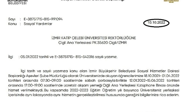 İzmir Büyükşehir Belediyesi ekonomik krizin derinden etkilediği üniversite öğrencilerinin beslenme sorununun çözümüne destek olmak amacıyla geçen yıl dört kamu üniversitesinde ücretsiz sıcak yemek dağıtım hizmeti başlatmış, bu yıl yeni eğitim öğretim yılının başlamasıyla birlikte mevcut dört kamu üniversitesine iki yeni üniversite daha dahil edilmiştir.