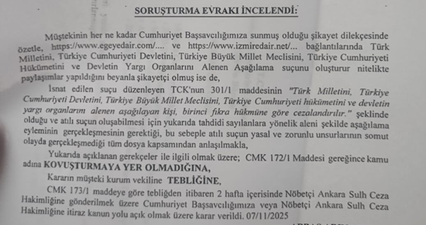 07.11.2025 tarihli kararı ile “SORUŞTURMAYA YER OLMADIĞINA” dair karar ile ifademizi bile almadan dava iptal edilmiştir.