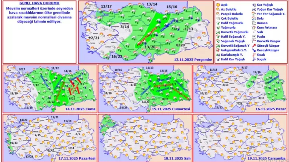 Kasım ayının ortasında kış erken yüzünü göstermeye başladı. Meteoroloji Genel Müdürlüğü, ülke genelinde soğuk hava ve yoğun yağış uyarısı yaptı. Bugünden itibaren özellikle Batı ve Orta Karadeniz ile Doğu Anadolu’nun yüksek kesimlerinde karla karışık yağmur ve kar yağışı bekleniyor. Hafta sonuna doğru yağışların etkisini artırarak doğu illerine kayması tahmin ediliyor.